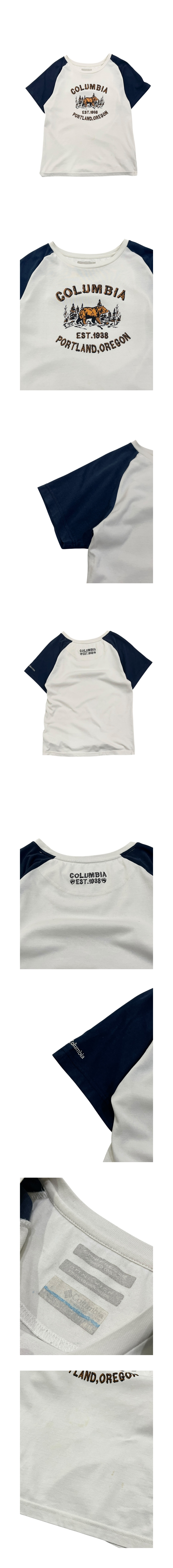 아웃도어 브랜드 COLUMBIA의 우먼 티셔츠입니다. 전면 얼룩 있는 상태입니다.